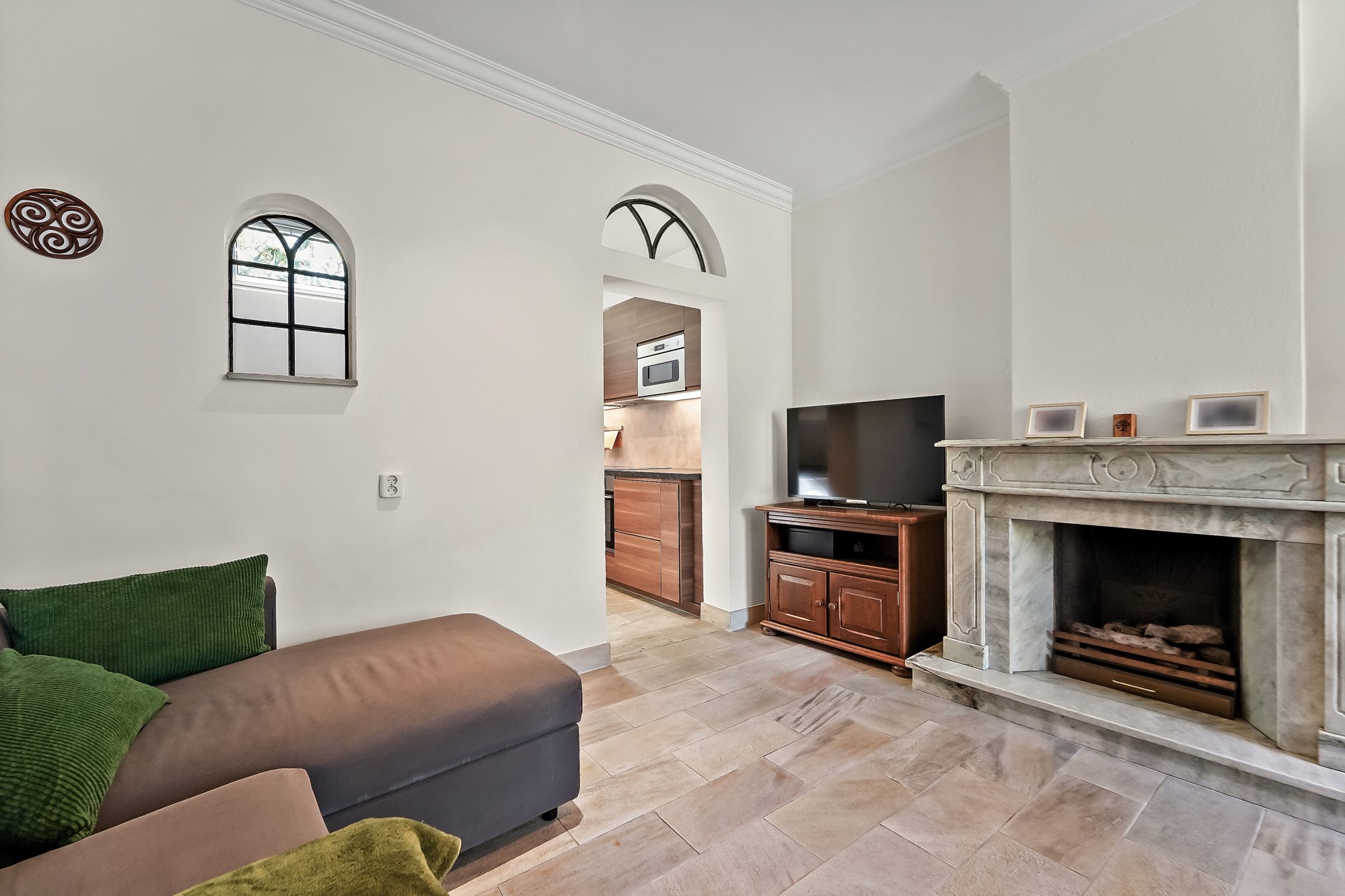 In de woonkamer zorgt de marmeren schouw met gashaard voor extra sfeer en warmte, de stenen vloer met vloerverwarming draagt bij aan een aangenaam wooncomfort, het hele jaar door. Via de open trap bereikt u de 1e verdieping.