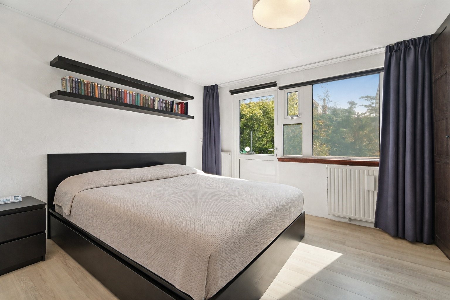 Aan de voorzijde bevindt zich een ruime slaapkamer, momenteel in gebruik als kantoor, met uitzicht op het groene Agnetapark.