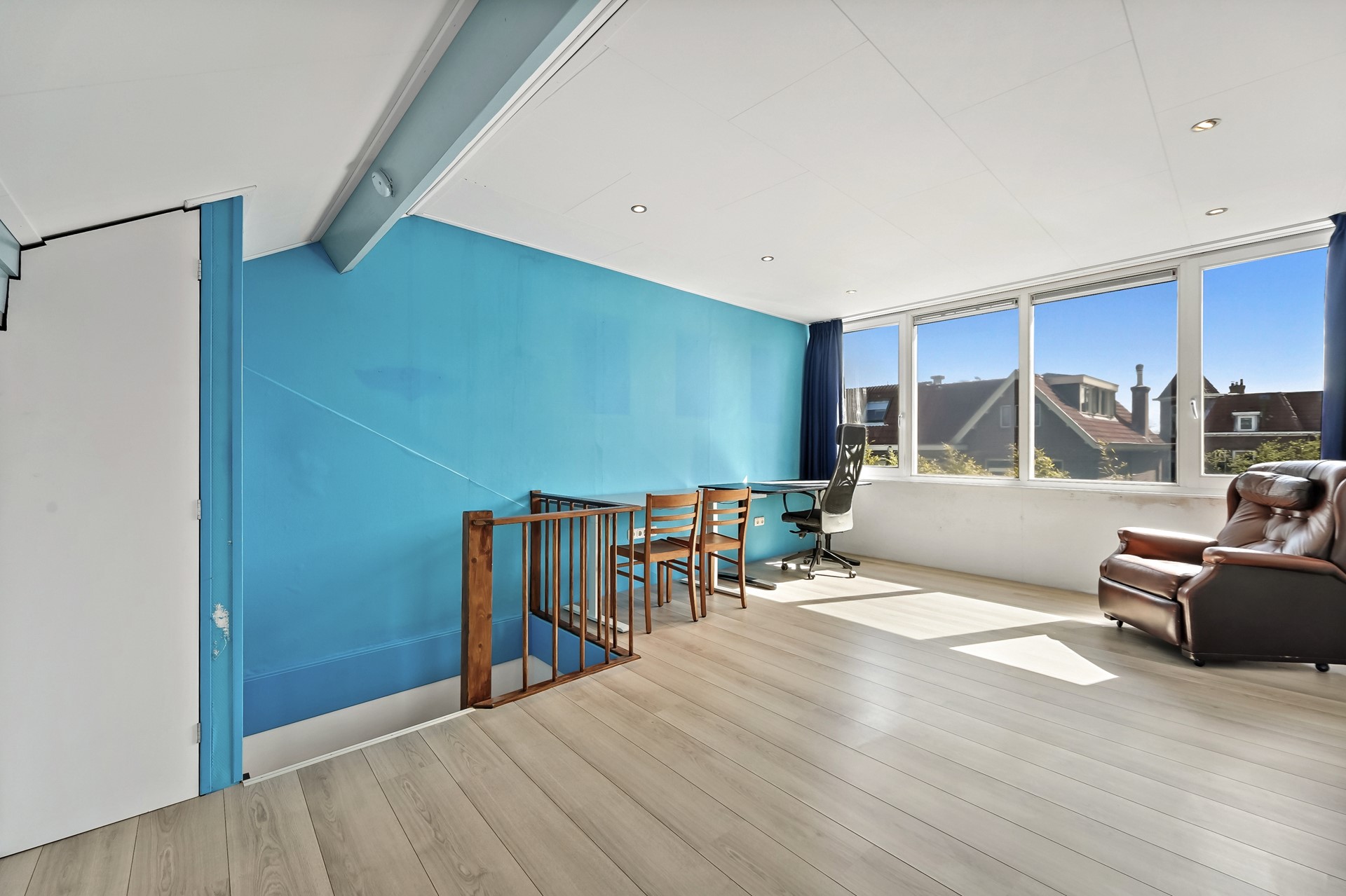 Zeer ruime verdieping met verrassend veel bergruimte achter de schuifdeuren. Deze veelzijdige ruimte is ideaal te gebruiken als hobbykamer, thuiswerkplek of slaapkamer.